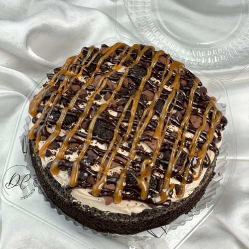 One layer of 6 inches sized cake frosted with whipped cream and with crunchy toppings and a sauce drizzled on top for a delicious dessert experience